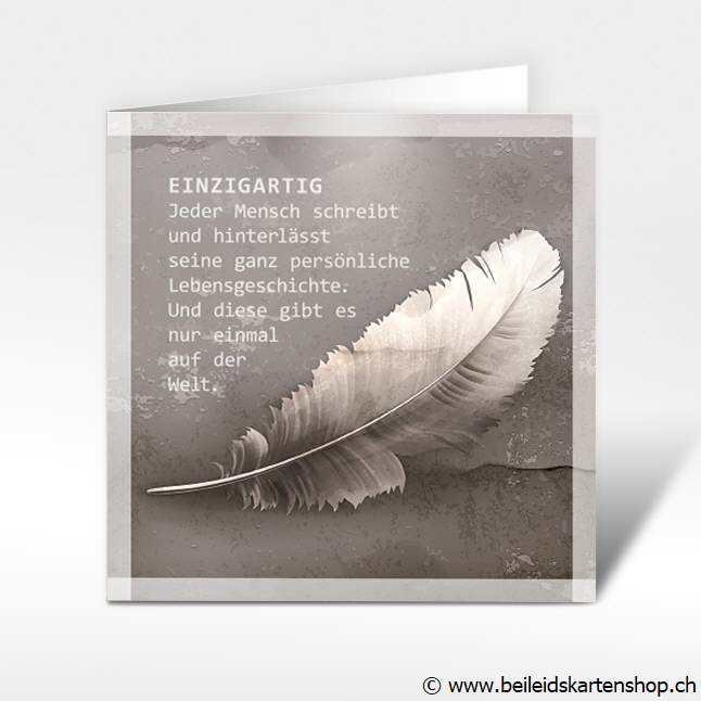Beileidskarten 42035 Beileidskarten/Trauerkarten mit Feder und Text Beileidskarten mit Feder Beileidskarte "Die Lebensgeschichte" mit Feder und TextFormat: 15 x 15 cmPapier: weissOhne Eindruck Aktion war erfolgreich Das hat leider nicht geklappt. Warenkorb anzeigen Zur Kasse gehen Weiter einkaufen Einlageblatt: ohne Einlageblatt mit Einlageblatt weiss Couvert: ohne Couvert mit Standard-Couvert weiss Anzahl: Stk In den Warenkorb Beileidskarten 42058 Beileidskarten 42065