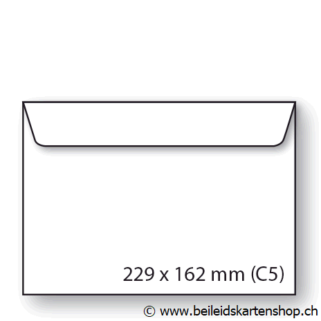 Couvert C5, 229 x 162 mm Couvert C5, ohne FensterFormat: 229 x 162 mmmit Abziehstreifen Aktion war erfolgreich Das hat leider nicht geklappt. Warenkorb anzeigen Zur Kasse gehen Weiter einkaufen Farbe: Weiss Standard White, gebrochenes weiss elfenbein Anzahl: Stk In den Warenkorb